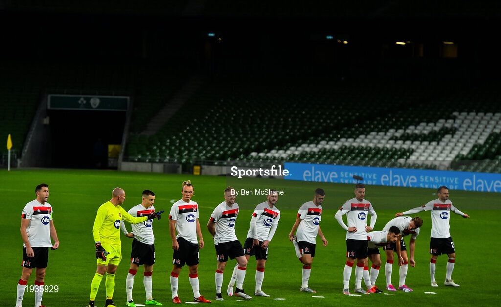 1 October 2020; The Dundalk team, from left, captain Brian Gartland, Gary Rogers, Darragh Leahy, Greg Sloggett, Sean Hoare, Sean Murray, Michael Duffy, Patrick McEleney, Patrick Hoban, Daniel Cleary and Stefan Colovic line-up ahead of the UEFA Europa League Play-off match between Dundalk and Ki Klaksvik at the Aviva Stadium in Dublin. Photo by Ben McShane/Sportsfile