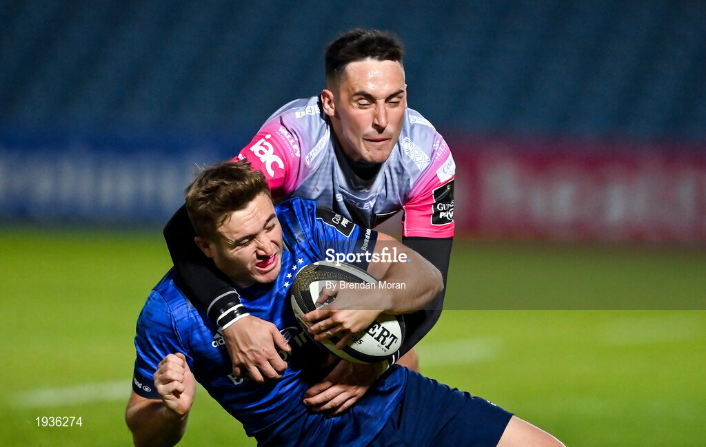 2 October 2020; Jordan Larmour of Leinster is tackled by Sam Davies of Dragons during the Guinness PRO14 match between Leinster and Dragons at the RDS Arena in Dublin. Photo by Brendan Moran/Sportsfile