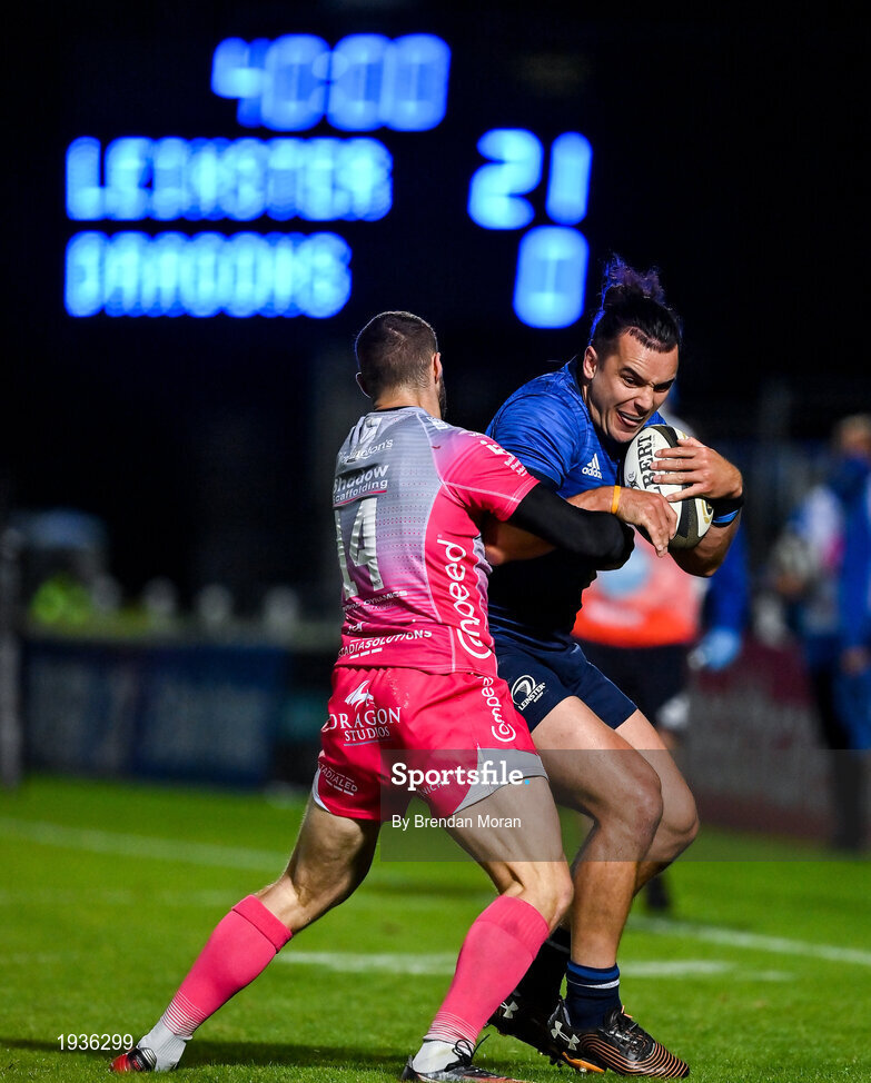 2 October 2020; James Lowe of Leinster is tackled by Jonah Holmes of Dragons during the Guinness PRO14 match between Leinster and Dragons at the RDS Arena in Dublin. Photo by Brendan Moran/Sportsfile