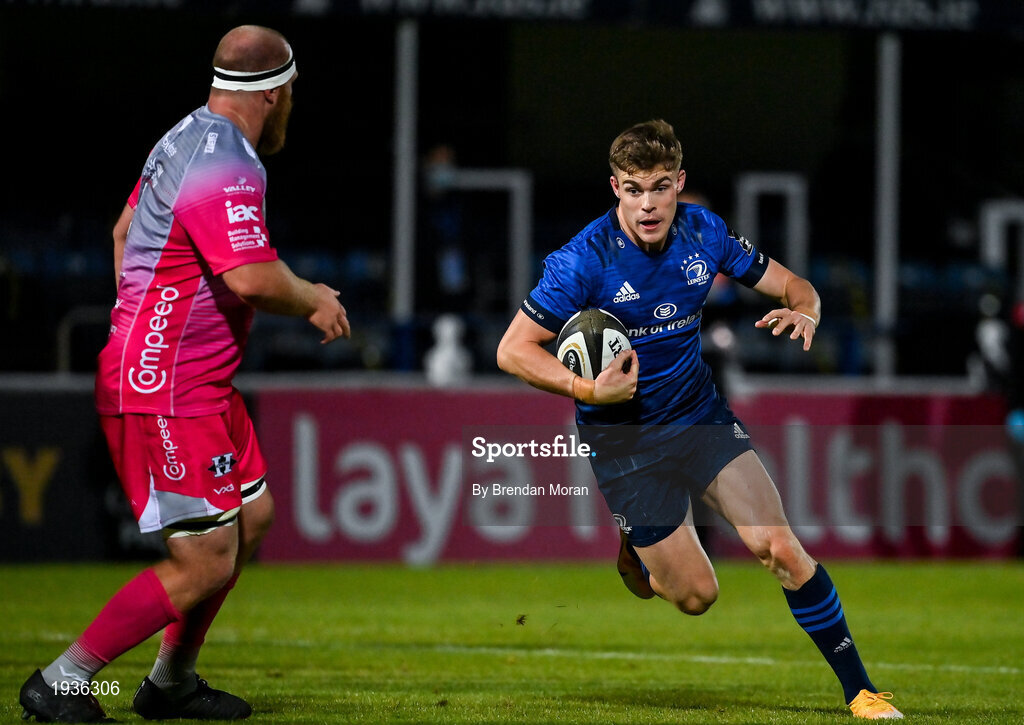 2 October 2020; Garry Ringrose of Leinster in action against Joe Davies of Dragons during the Guinness PRO14 match between Leinster and Dragons at the RDS Arena in Dublin. Photo by Brendan Moran/Sportsfile