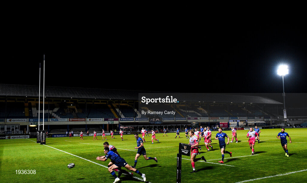 2 October 2020; Hugo Keenan of Leinster in action against Jonah Holmes of Dragons during the Guinness PRO14 match between Leinster and Dragons at the RDS Arena in Dublin. Photo by Ramsey Cardy/Sportsfile