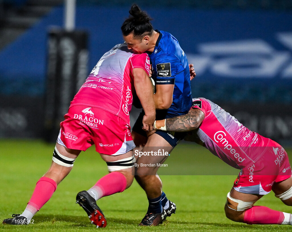 2 October 2020; James Lowe of Leinster is tackled by Joe Davies, left, and Ross Moriarty of Dragons during the Guinness PRO14 match between Leinster and Dragons at the RDS Arena in Dublin. Photo by Brendan Moran/Sportsfile