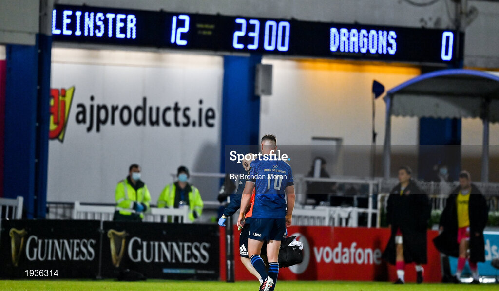 2 October 2020; Jonathan Sexton of Leinster leaves the pitch during the Guinness PRO14 match between Leinster and Dragons at the RDS Arena in Dublin. Photo by Brendan Moran/Sportsfile