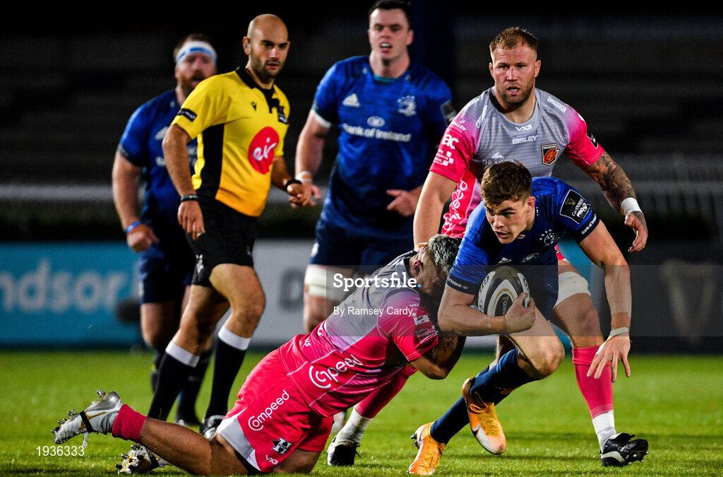 2 October 2020; Garry Ringrose of Leinster is tackled by Joe Davies of Dragons during the Guinness PRO14 match between Leinster and Dragons at the RDS Arena in Dublin. Photo by Ramsey Cardy/Sportsfile