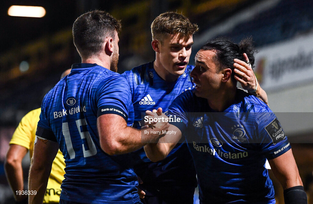 2 October 2020; James Lowe of Leinster celebrates after scoring his side's fourth try with team-maes Hugo Keenan and Garry Ringrose during the Guinness PRO14 match between Leinster and Dragons at the RDS Arena in Dublin. Photo by Harry Murphy/Sportsfile