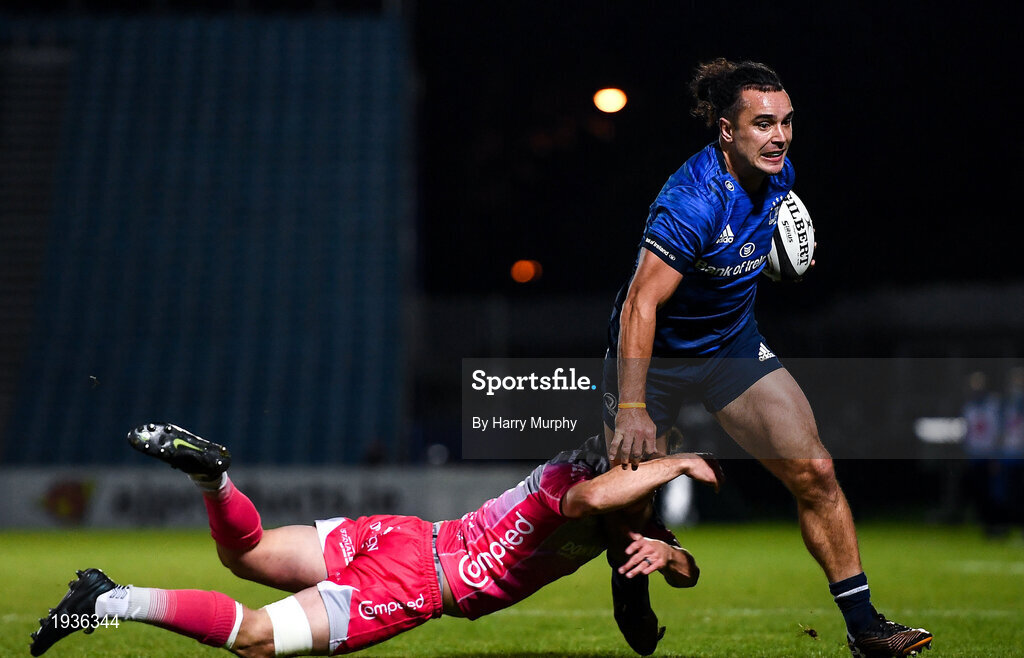 2 October 2020; James Lowe of Leinster escapes the tackle of Josh Lewis of Dragons on his way to scoring his side's fourth try during the Guinness PRO14 match between Leinster and Dragons at the RDS Arena in Dublin. Photo by Harry Murphy/Sportsfile