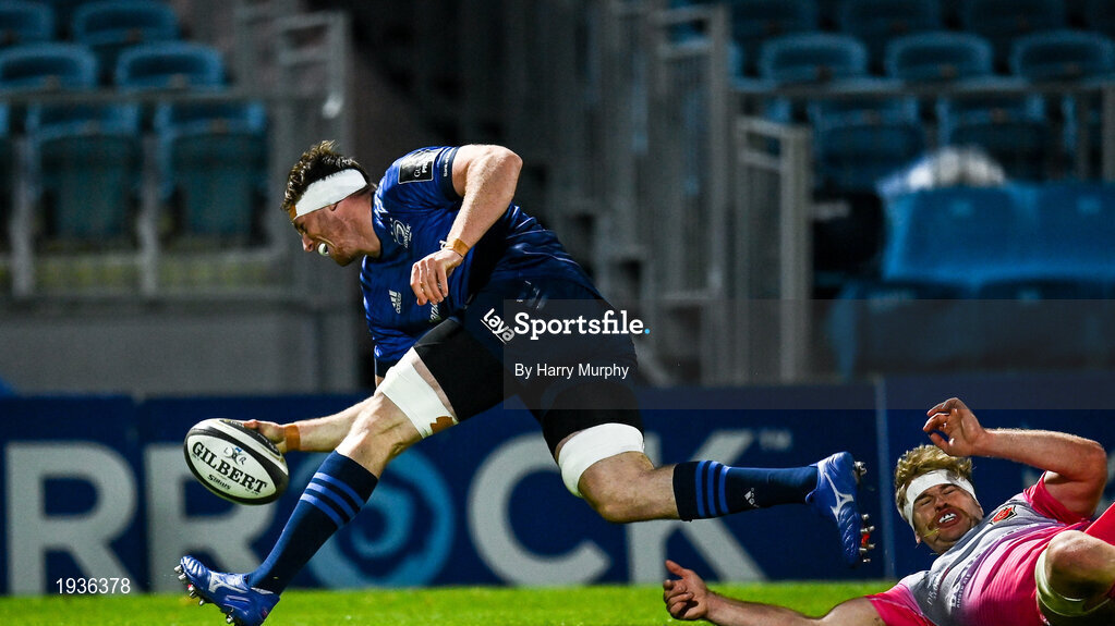 2 October 2020; Ryan Baird of Leinster scores his side's fifth try during the Guinness PRO14 match between Leinster and Dragons at the RDS Arena in Dublin. Photo by Harry Murphy/Sportsfile