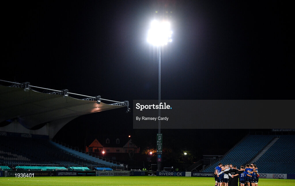2 October 2020; The Leinster team huddles following the Guinness PRO14 match between Leinster and Dragons at the RDS Arena in Dublin. Photo by Ramsey Cardy/Sportsfile