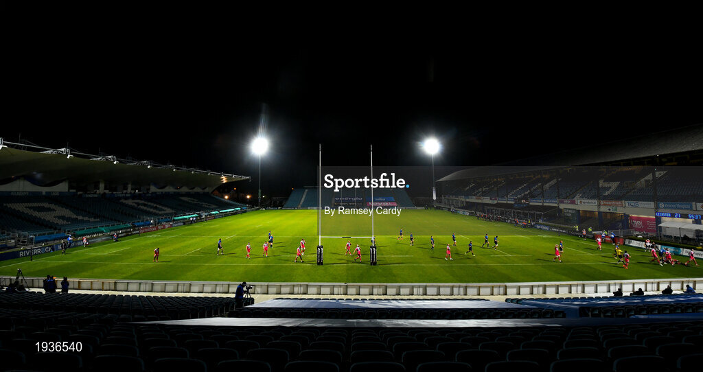 2 October 2020; James Lowe of Leinster scores his side's fourth try despite the tackle of Jonah Holmes of Dragons during the Guinness PRO14 match between Leinster and Dragons at the RDS Arena in Dublin. Photo by Ramsey Cardy/Sportsfile