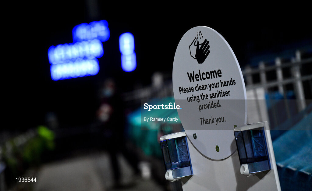 2 October 2020; A view of a hand santising station during the Guinness PRO14 match between Leinster and Dragons at the RDS Arena in Dublin. Photo by Ramsey Cardy/Sportsfile