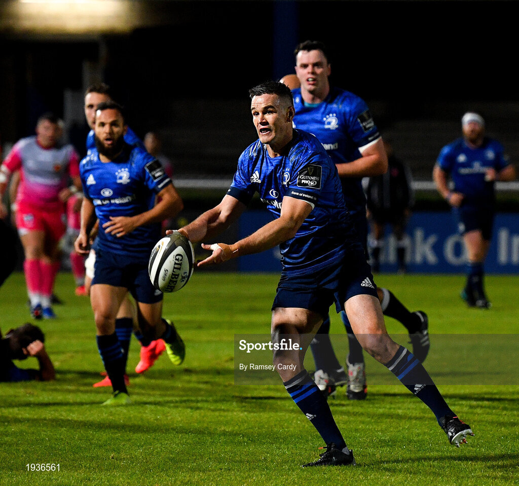 2 October 2020; Jonathan Sexton of Leinster passes to set up a try by team-mate Jordan Larmour during the Guinness PRO14 match between Leinster and Dragons at the RDS Arena in Dublin. Photo by Ramsey Cardy/Sportsfile