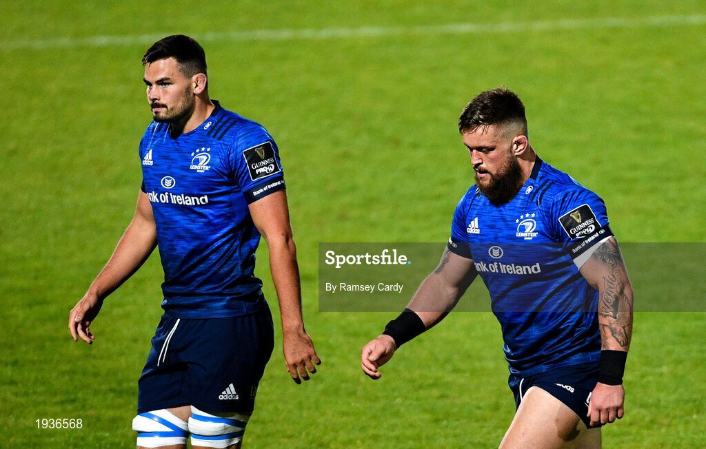2 October 2020; Andrew Porter, right, and Max Deegan of Leinster during the Guinness PRO14 match between Leinster and Dragons at the RDS Arena in Dublin. Photo by Ramsey Cardy/Sportsfile
