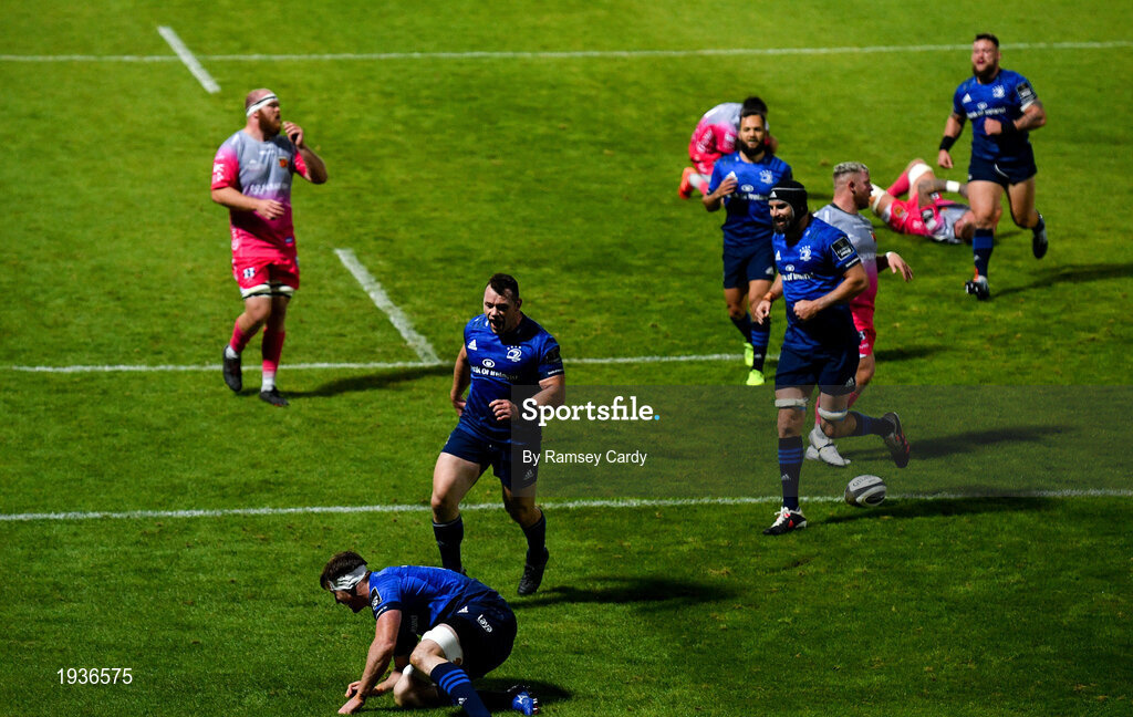2 October 2020; Ryan Baird of Leinster celebrates after scoring his side's fifth try during the Guinness PRO14 match between Leinster and Dragons at the RDS Arena in Dublin. Photo by Ramsey Cardy/Sportsfile