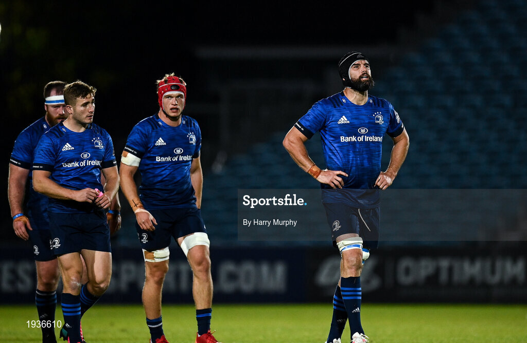 2 October 2020; Leinster players, from right, Scott Fardy, Josh van der Flier, Jordan Larmour and Michael Bent during the Guinness PRO14 match between Leinster and Dragons at the RDS Arena in Dublin. Photo by Harry Murphy/Sportsfile