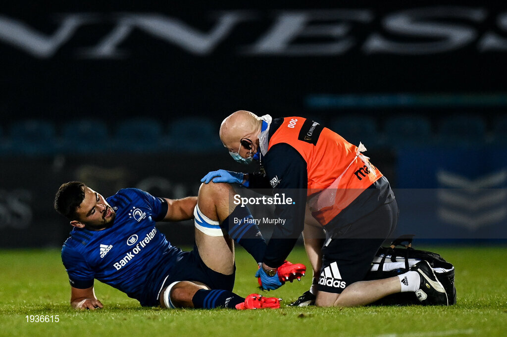 2 October 2020; Max Deegan of Leinster receives treatement on an injury during the Guinness PRO14 match between Leinster and Dragons at the RDS Arena in Dublin. Photo by Harry Murphy/Sportsfile