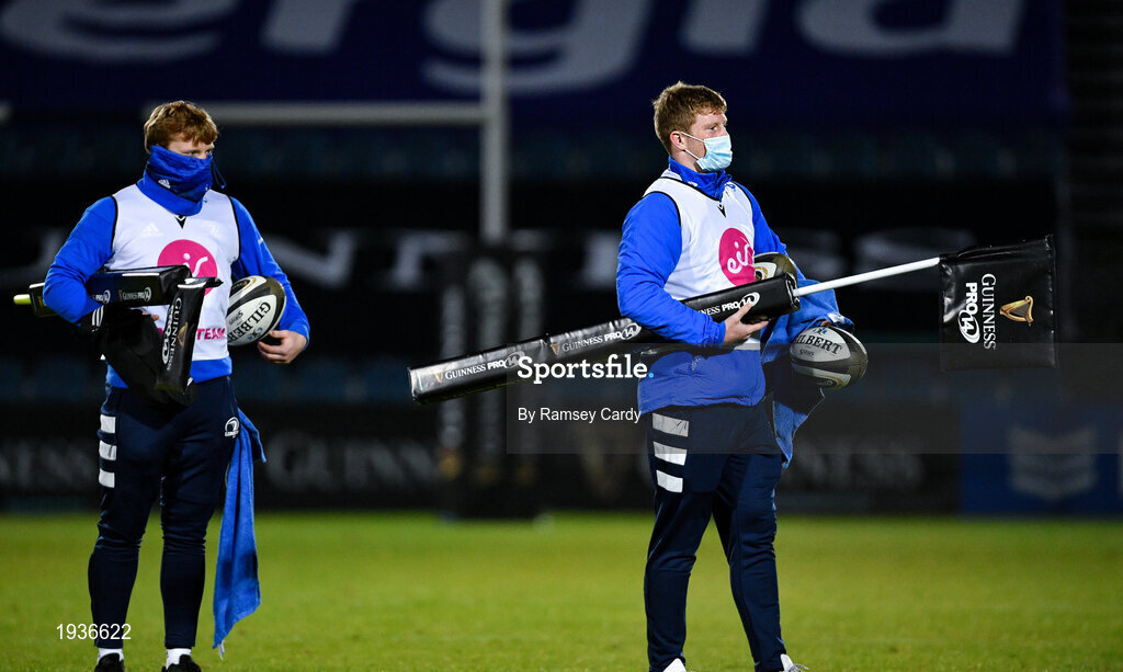 2 October 2020; Leinster academy players Martin Moloney, left, and Sean O'Brien, working as members of the ball team, during the Guinness PRO14 match between Leinster and Dragons at the RDS Arena in Dublin. Photo by Ramsey Cardy/Sportsfile