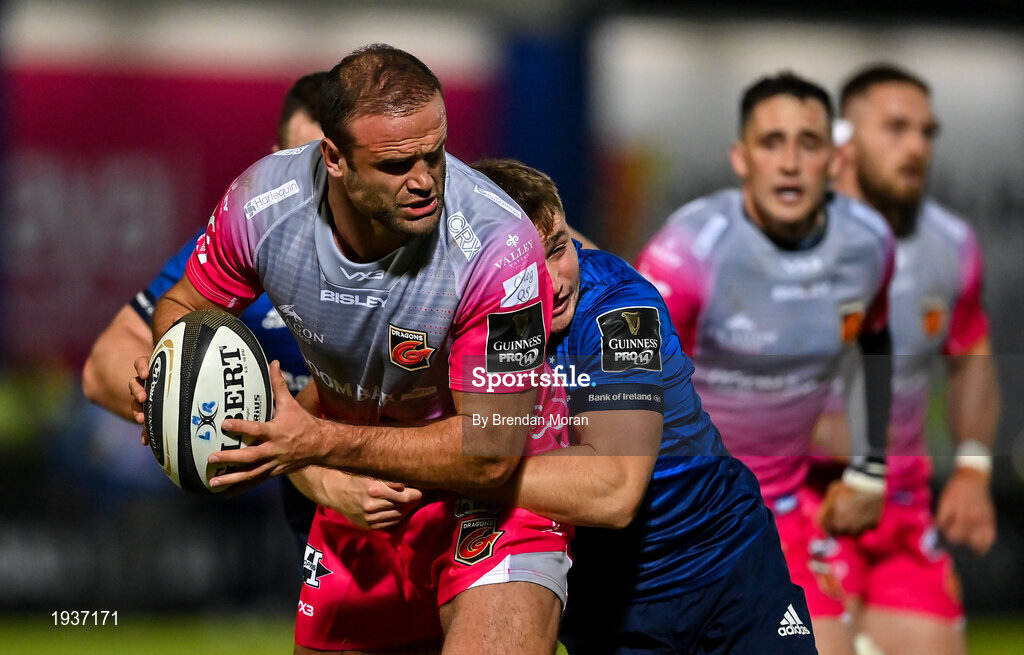 2 October 2020; Jamie Roberts of Dragons is tackled by Jordan Larmour of Leinster during the Guinness PRO14 match between Leinster and Dragons at the RDS Arena in Dublin. Photo by Brendan Moran/Sportsfile