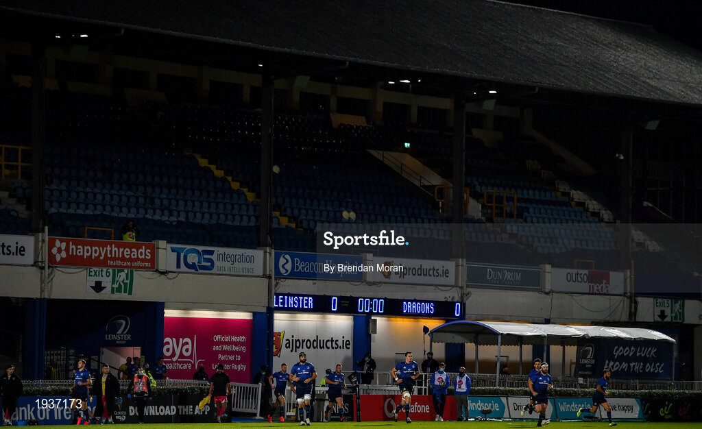 2 October 2020; The Leinster team run onto the pitch in front of empty stands prior to the Guinness PRO14 match between Leinster and Dragons at the RDS Arena in Dublin. Photo by Brendan Moran/Sportsfile