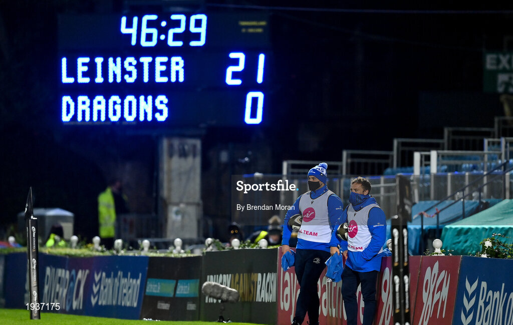 2 October 2020; Leinster academy players, Thomas Clarkson, left, and Liam Turner, working as members of the ball team, during the Guinness PRO14 match between Leinster and Dragons at the RDS Arena in Dublin. Photo by Brendan Moran/Sportsfile