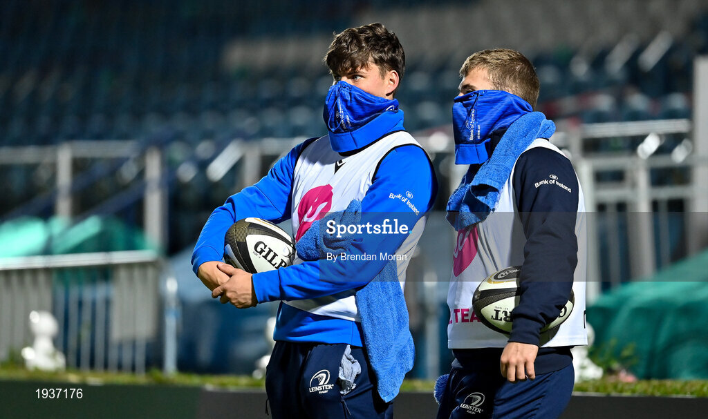 2 October 2020; Leinster academy players, Max O'Reilly, left, and John McKee, working as members of the ball team, during the Guinness PRO14 match between Leinster and Dragons at the RDS Arena in Dublin. Photo by Brendan Moran/Sportsfile