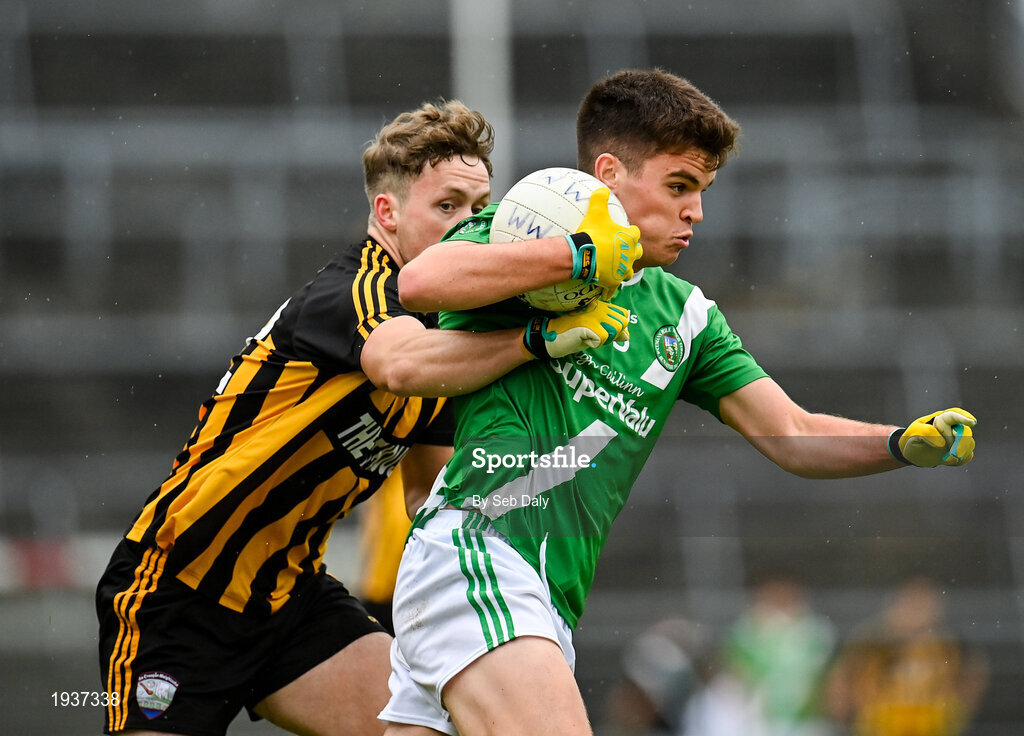 4 October 2020; Pól Ó Ceallaigh of Moycullen in action against Leo Donnellan of Mountbellew-Moylough during the Galway County Senior Football Championship Final match between Moycullen and Mountbellew-Moylough at Pearse Stadium in Galway. Photo by Seb Daly/Sportsfile