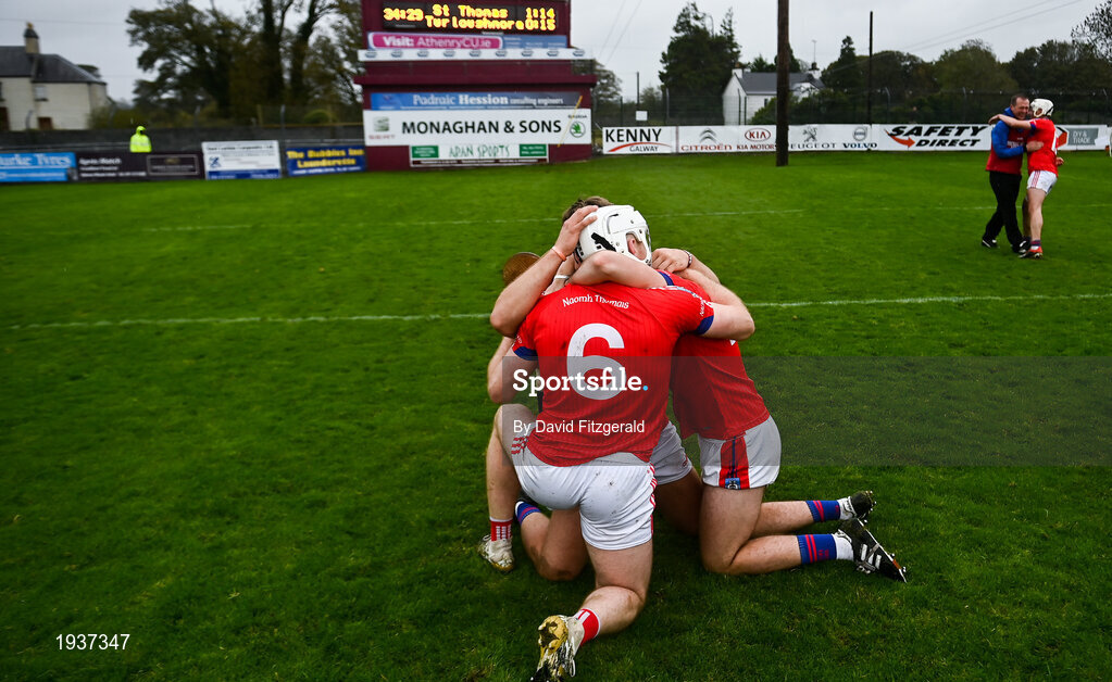 4 October 2020; St Thomas players, from left, Fintan Burke, Shane Cooney and Evan Duggan celebrate following the Galway County Senior Hurling Championship Final match between Turloughmore and St Thomas at Kenny Park in Athenry, Galway. Photo by David Fitzgerald/Sportsfile