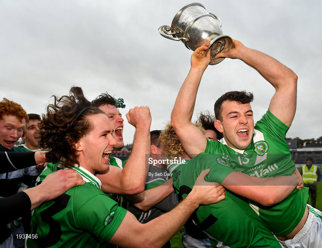 4 October 2020; Moycullen captain Deasún Ó Conghaile, right, celebrates with team-mates following their side's victory in the Galway County Senior Football Championship Final match between Moycullen and Mountbellew-Moylough at Pearse Stadium in Galway. Photo by Seb Daly/Sportsfile