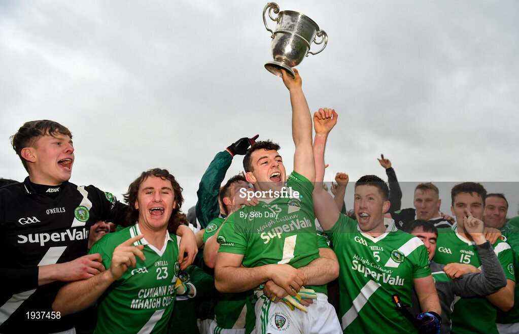 4 October 2020; Moycullen captain Deasún Ó Conghaile, centre, celebrates with team-mates following their side's victory in the Galway County Senior Football Championship Final match between Moycullen and Mountbellew-Moylough at Pearse Stadium in Galway. Photo by Seb Daly/Sportsfile