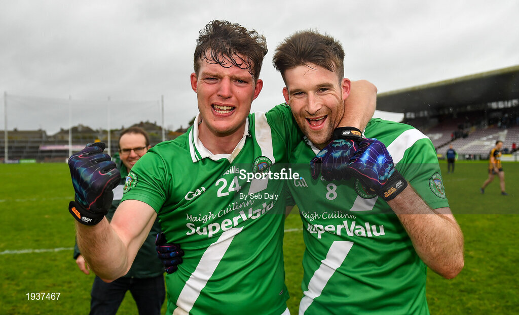 4 October 2020; Eoghan Ó Galloichuir, left, and Tomás Ó Cleireach of Moycullen celebrate following their side's victory in the Galway County Senior Football Championship Final match between Moycullen and Mountbellew-Moylough at Pearse Stadium in Galway. Photo by Seb Daly/Sportsfile