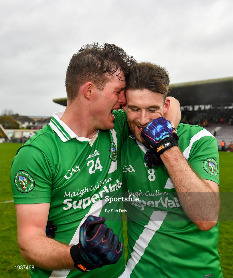4 October 2020; Eoghan Ó Galloichuir, left, and Tomás Ó Cleireach of Moycullen celebrate following their side's victory in the Galway County Senior Football Championship Final match between Moycullen and Mountbellew-Moylough at Pearse Stadium in Galway. Photo by Seb Daly/Sportsfile