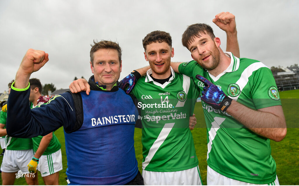 4 October 2020; Moycullen manager Donal Ó Coinnialláin, left, celebrates with Neil Breathnach, centre, and Tomás Ó Cleireach following their side's victory in the Galway County Senior Football Championship Final match between Moycullen and Mountbellew-Moylough at Pearse Stadium in Galway. Photo by Seb Daly/Sportsfile