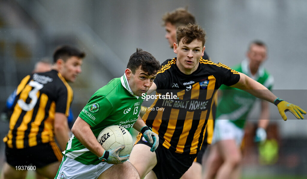 4 October 2020; Deasún Ó Conghaile of Moycullen in action against Matthew Barrett of Mountbellew-Moylough during the Galway County Senior Football Championship Final match between Moycullen and Mountbellew-Moylough at Pearse Stadium in Galway. Photo by Seb Daly/Sportsfile