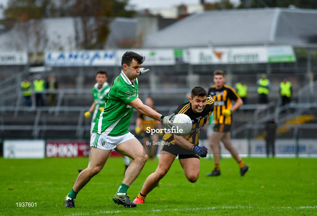4 October 2020; Deasún Ó Conghaile of Moycullen kicks a point under pressure from Gary Sweeney of Mountbellew-Moylough during the Galway County Senior Football Championship Final match between Moycullen and Mountbellew-Moylough at Pearse Stadium in Galway. Photo by Seb Daly/Sportsfile