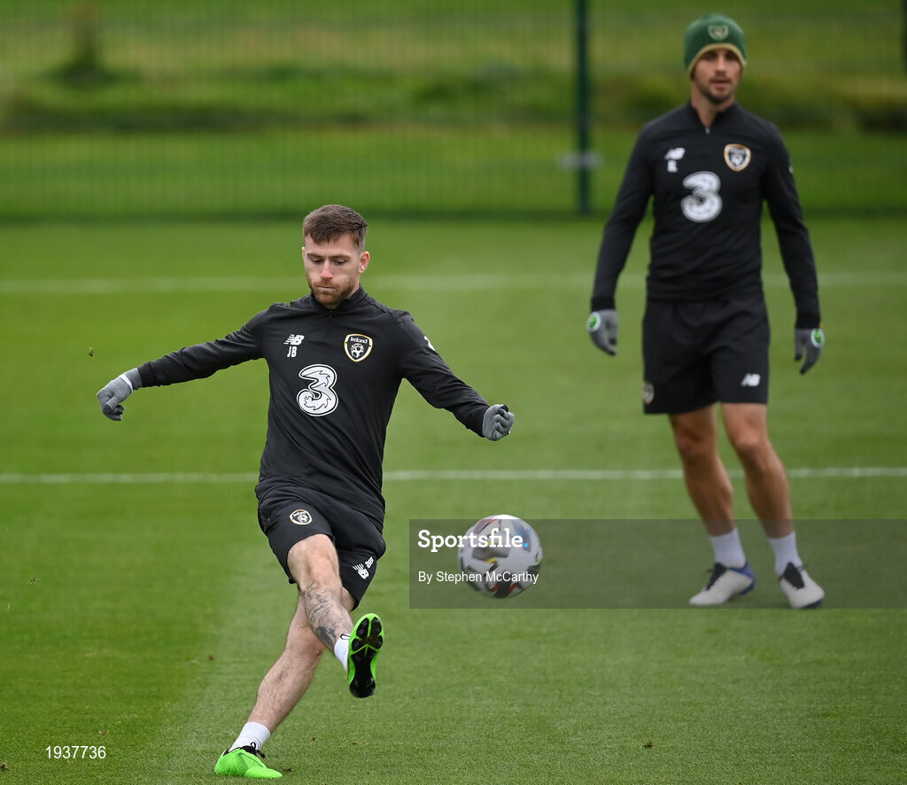 5 October 2020; Jack Byrne, left, and Shane Long during a Republic of Ireland training session at FAI National Training Centre in Abbotstown, Dublin. Photo by Stephen McCarthy/Sportsfile