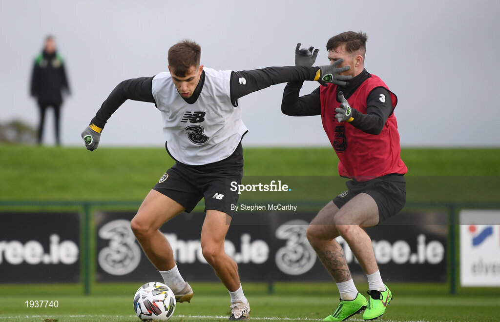 5 October 2020; Jayson Molumby, left, is tackled by Jack Byrne during a Republic of Ireland training session at FAI National Training Centre in Abbotstown, Dublin. Photo by Stephen McCarthy/Sportsfile