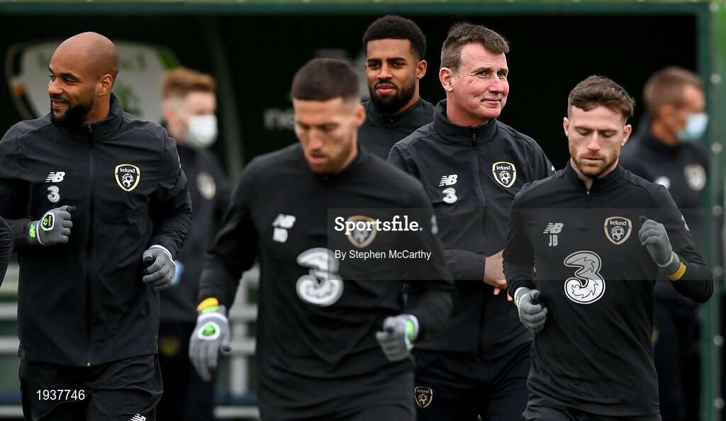 5 October 2020; Republic of Ireland manager Stephen Kenny with players, from left, David McGoldrick, Matt Doherty, Cyrus Christie and Jack Byrne during a Republic of Ireland training session at the FAI National Training Centre in Abbotstown, Dublin. Photo by Stephen McCarthy/Sportsfile