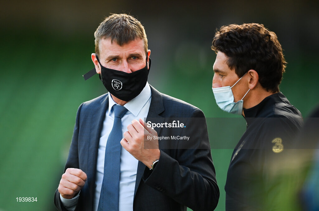 11 October 2020; Republic of Ireland manager Stephen Kenny, right, and Republic of Ireland coach Keith Andrews ahead of the UEFA Nations League B match between Republic of Ireland and Wales at the Aviva Stadium in Dublin. Photo by Stephen McCarthy/Sportsfile