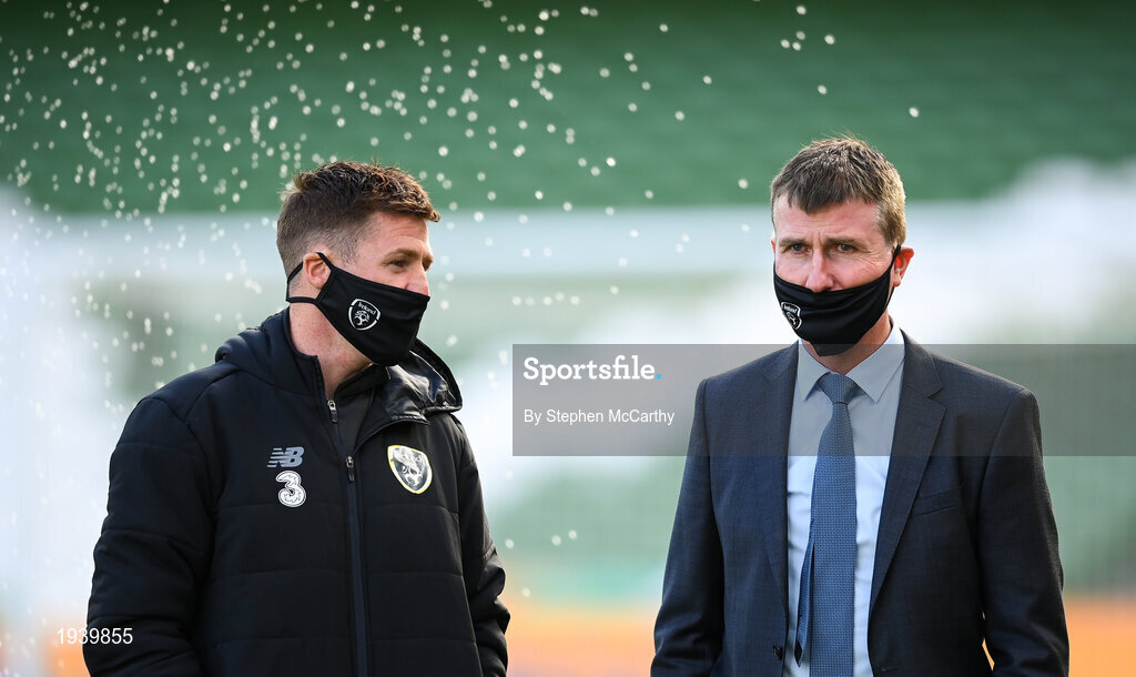11 October 2020; Republic of Ireland manager Stephen Kenny, right, with James McCarthy ahead of the UEFA Nations League B match between Republic of Ireland and Wales at the Aviva Stadium in Dublin. Photo by Stephen McCarthy/Sportsfile