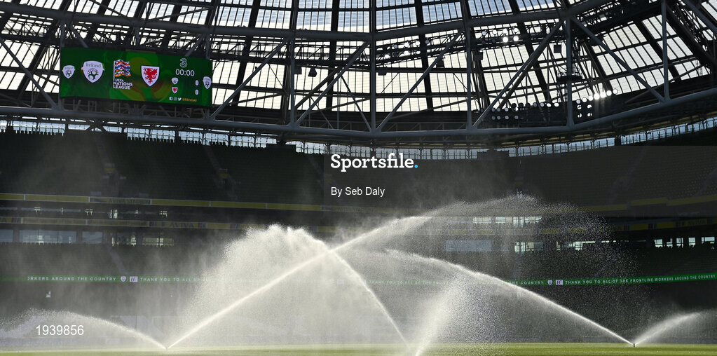 11 October 2020; Sprinklers water the pitch prior to the UEFA Nations League B match between Republic of Ireland and Wales at the Aviva Stadium in Dublin. Photo by Seb Daly/Sportsfile