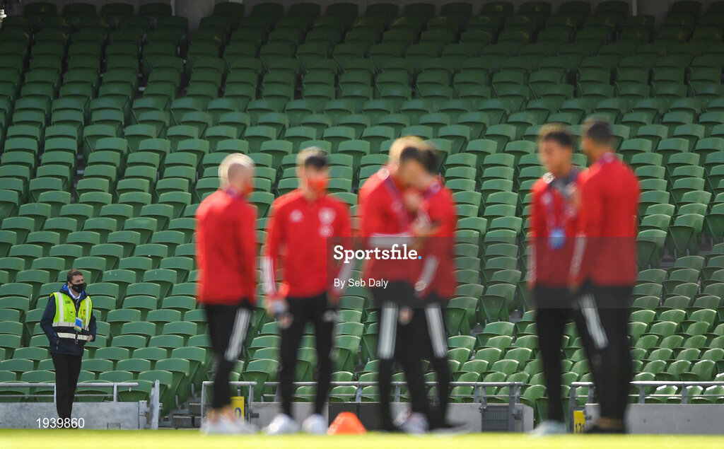 11 October 2020; A security guard stands watch in front of a block of empty seating as Wales players walk the pitch prior the UEFA Nations League B match between Republic of Ireland and Wales at the Aviva Stadium in Dublin. Photo by Seb Daly/Sportsfile