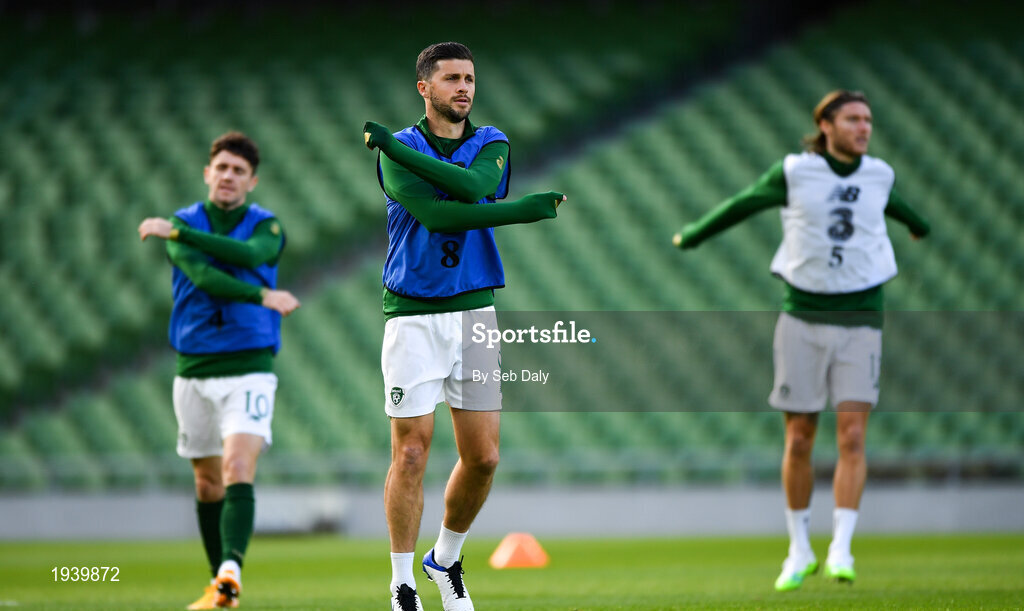 11 October 2020; Shane Long of Republic of Ireland, centre, warms-up alongside team-mates Robbie Brady, left, and Jeff Hendrick prior to the UEFA Nations League B match between Republic of Ireland and Wales at the Aviva Stadium in Dublin. Photo by Seb Daly/Sportsfile