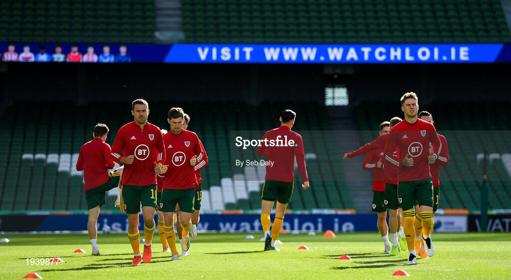 11 October 2020; Wales players, including Aaron Ramsey, left, and Joe Rodon, right, warm-up prior to the UEFA Nations League B match between Republic of Ireland and Wales at the Aviva Stadium in Dublin. Photo by Seb Daly/Sportsfile