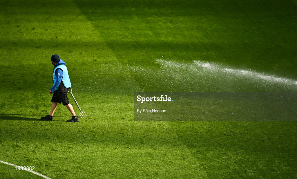 11 October 2020; A groundsman repairs divots on the pitch ahead of the UEFA Nations League B match between Republic of Ireland and Wales at the Aviva Stadium in Dublin. Photo by Eóin Noonan/Sportsfile