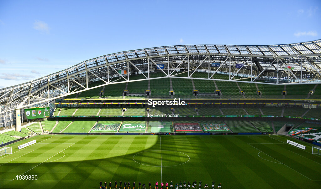 11 October 2020; Players of both sides line-up ahead of the UEFA Nations League B match between Republic of Ireland and Wales at the Aviva Stadium in Dublin. Photo by Eóin Noonan/Sportsfile