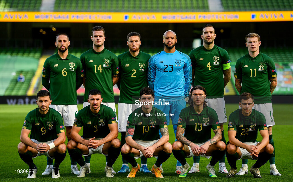 11 October 2020; The Republic of Ireland team, back row, from left, Conor Hourihane, Kevin Long, Matt Doherty, Darren Randolph, Shane Duffy, James McClean. Bottom row, from left, Shane Long, Enda Stevens, Robbie Brady, Jeff Hendrick and Jayson Molumby ahead of the UEFA Nations League B match between Republic of Ireland and Wales at the Aviva Stadium in Dublin. Photo by Stephen McCarthy/Sportsfile