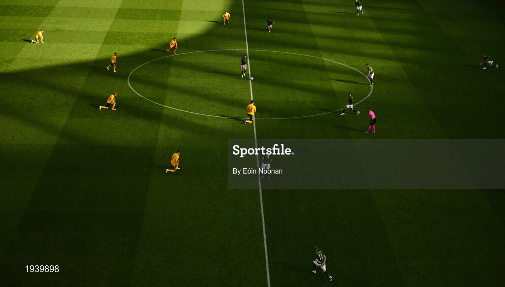 11 October 2020; Players from both sides take a knee in support of the Black Lives Matter movement ahead ahead of the UEFA Nations League B match between Republic of Ireland and Wales at the Aviva Stadium in Dublin. Photo by Eóin Noonan/Sportsfile