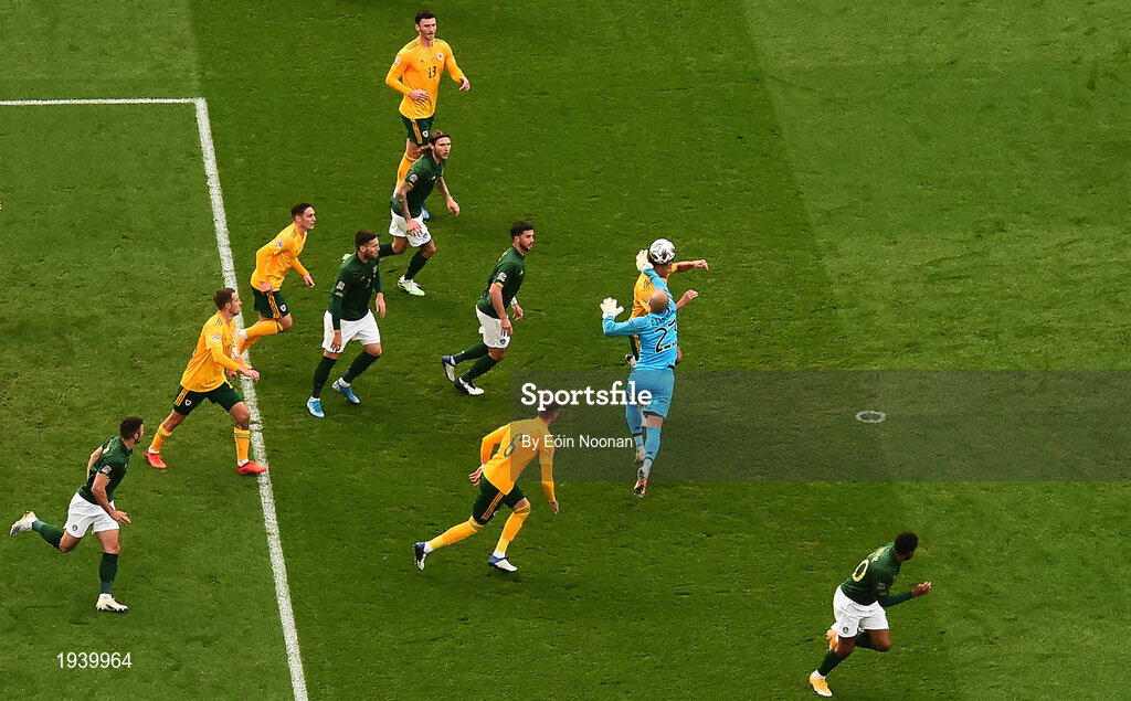 11 October 2020; Darren Randolph of Republic of Ireland in action against Ethan Ampadu of Wales during the UEFA Nations League B match between Republic of Ireland and Wales at the Aviva Stadium in Dublin. Photo by Eóin Noonan/Sportsfile