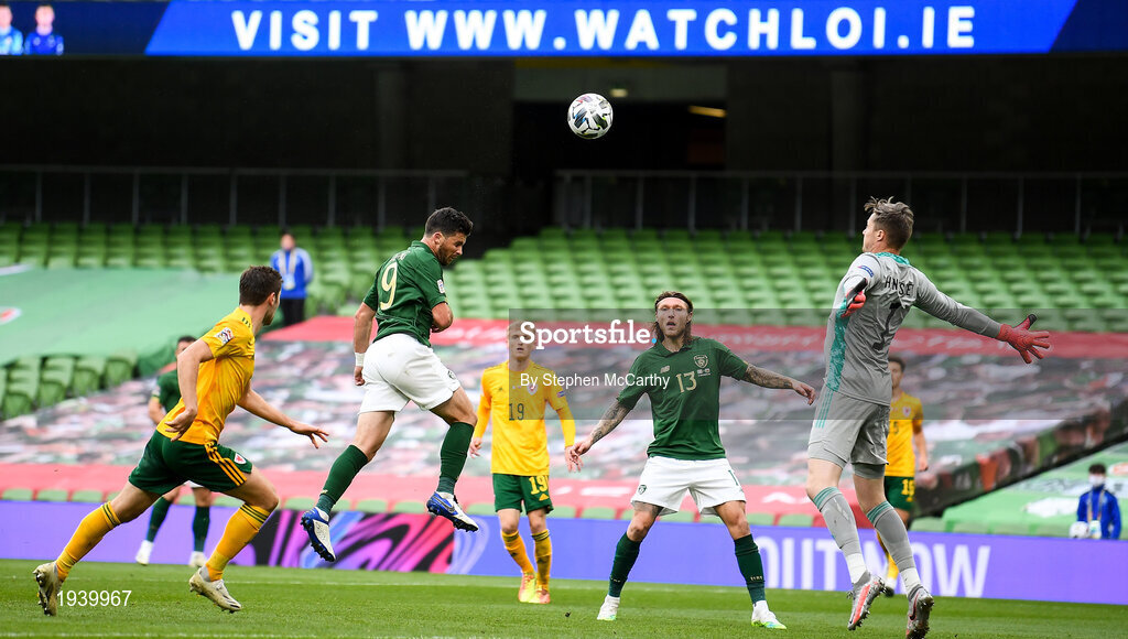 11 October 2020; Shane Long of Republic of Ireland has a header on goal during the UEFA Nations League B match between Republic of Ireland and Wales at the Aviva Stadium in Dublin. Photo by Stephen McCarthy/Sportsfile