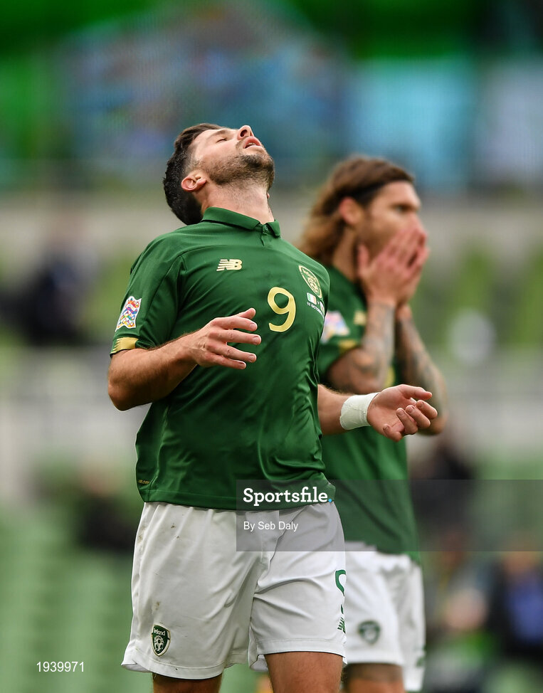 11 October 2020; Shane Long of Republic of Ireland reacts after heading over during the UEFA Nations League B match between Republic of Ireland and Wales at the Aviva Stadium in Dublin. Photo by Seb Daly/Sportsfile