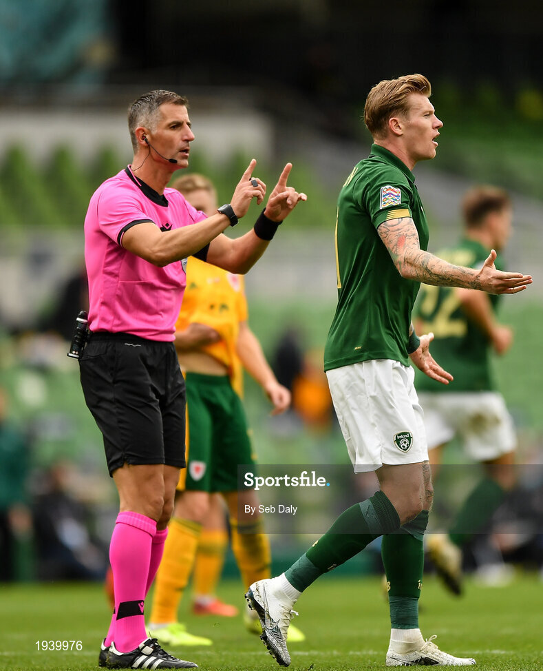 11 October 2020; James McClean of Republic of Ireland remonstrates with referee Tasos Sidiropoulos during the UEFA Nations League B match between Republic of Ireland and Wales at the Aviva Stadium in Dublin. Photo by Seb Daly/Sportsfile